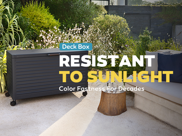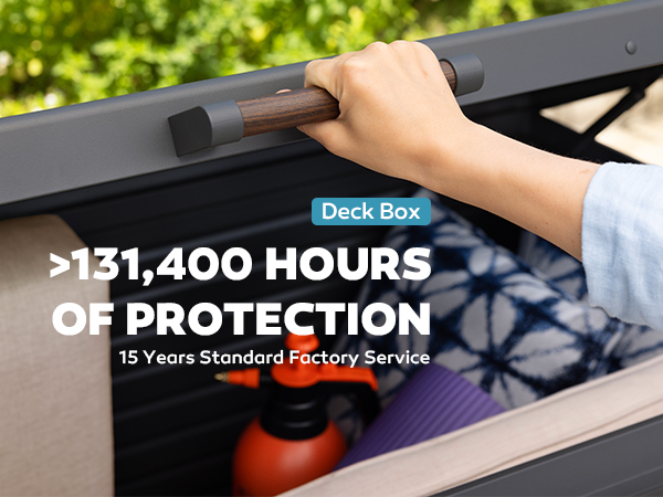The deck box is equipped with a wood grain handle, adding a touch of natural elegance while offering a comfortable, sturdy grip for easy access.