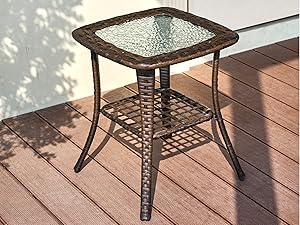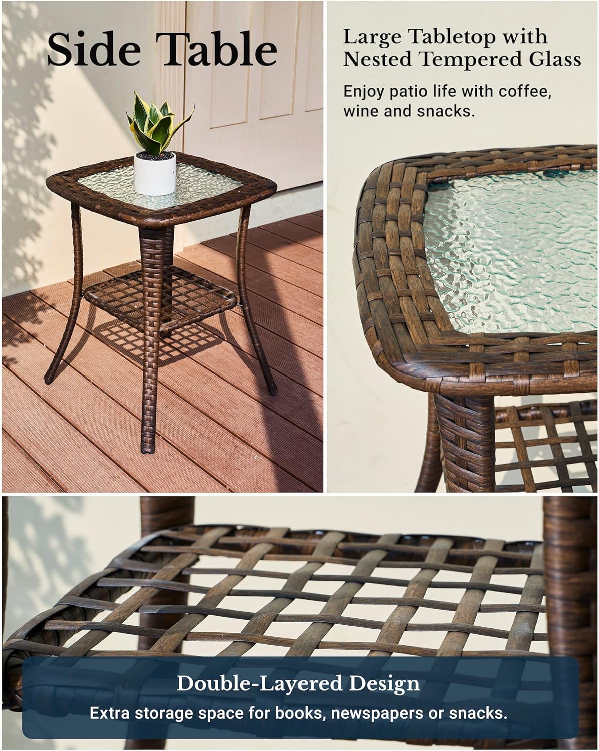 Elegantly designed side table complements any porch, with a spacious tempered glass top for coffee, fruit, and more.